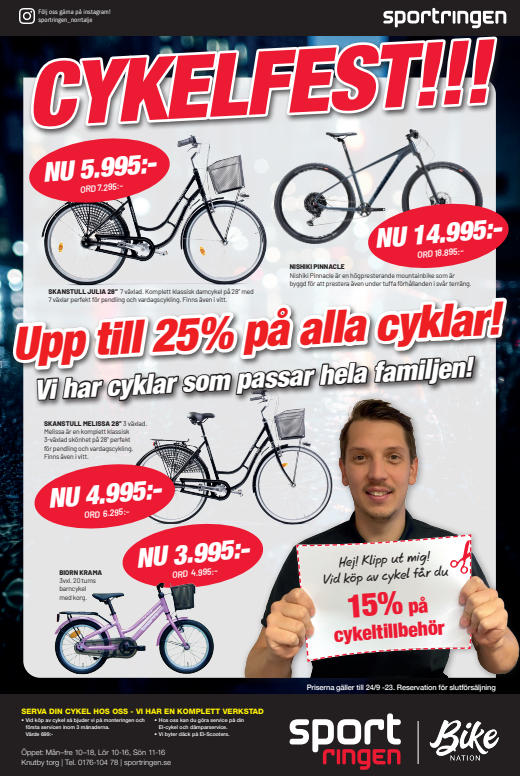 Här finner ni cyklar från Sportringen Norrtäljes butik till förmånliga priser samt våra avtalsföreningars och företagsprofiler. Kika gärna in på vår nya sida Bands N Brands där privatpersoner, små independentföretag och musiker säljer sina produkter genom oss.